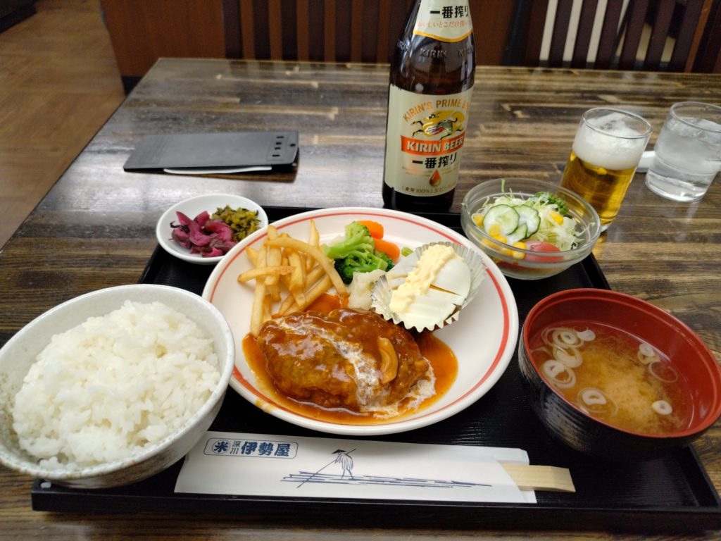 一目散に「伊勢屋」に向かい、ランチに日替わり「煮込みハンバーグ」&瓶ビール。