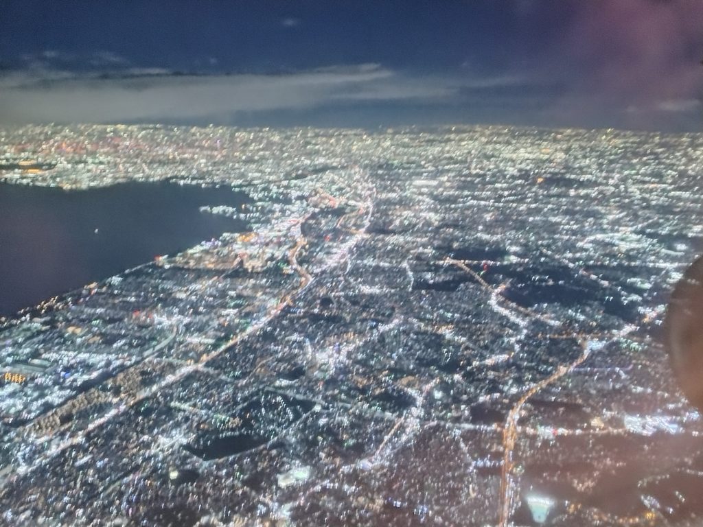 着陸態勢に入った機内窓外には、光の筋が一面に広がる。