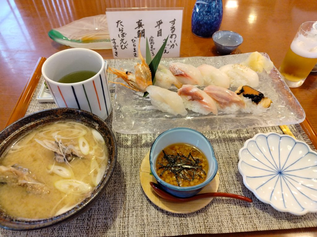 暖簾をくぐり、早速ビールに熱燗。肴は、まず飛島産夏イカのつくり。白くなく透明なイカ。さらに、庄内浜まるごと握りセット。