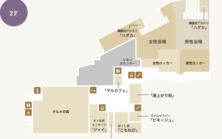 浴槽に浸かったり出て、椅子で寛ぐなどしていると、1~2時間くらいはあっという間に過ぎてしまう(2階館内図)。