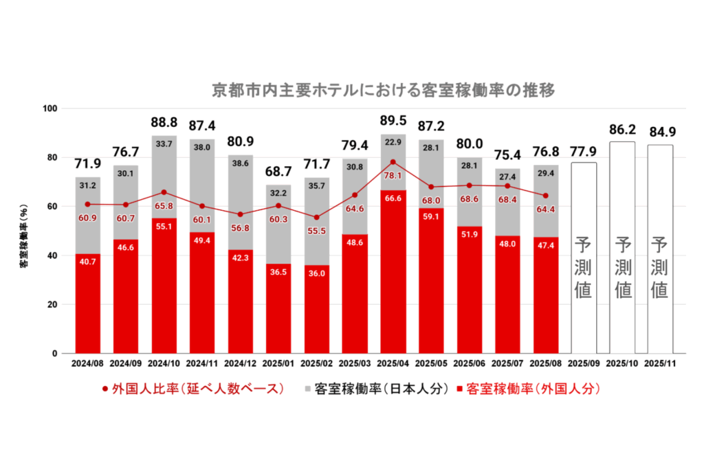 8月時点の今後の客室稼働率の予測値は、9月が77.9%(前年同月実績76.7%)、10月が86.2%(同88.8%)、11月が84.9%(同87.4%)となった。前年並みの水準で推移し、10月に需要のピークを迎える見通しである。