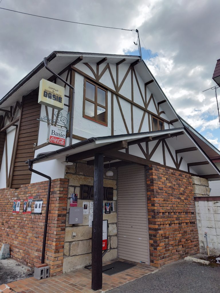 バス停で「一高前」とある。一ノ関一高に通じる道筋に佇む一軒家風。此処がジャズ喫茶「BASIE(ベイシー)」。隣には長屋ののように昭和の趣きを残す飲食店が連なる。道筋奥正面には一高が居丈高のように鎮座していた。