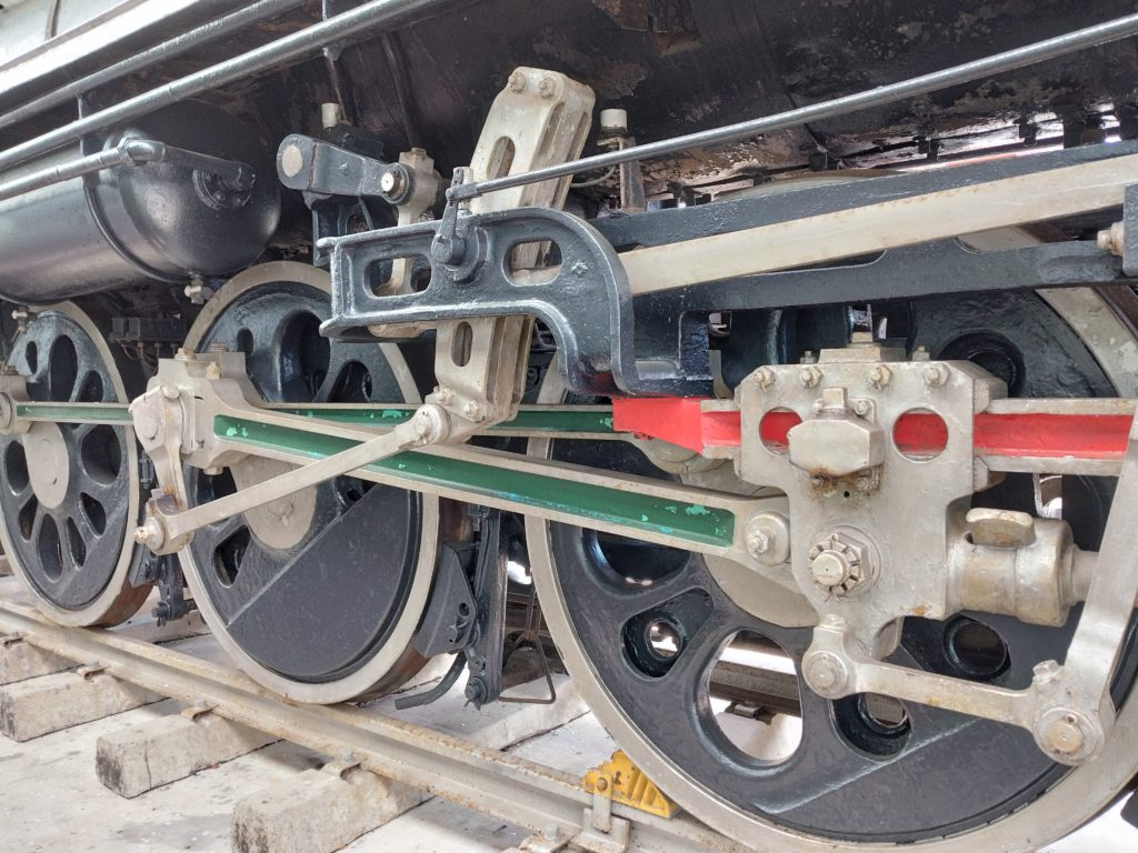 機関車の車輪の大きいこと。内輪だけでもゆうに成人男性の背丈を上回る。