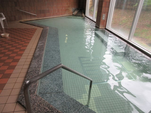 大きめの内湯は、外光の反射か薄緑色のようだ。湯温は41℃くらいだろうか、ゆっくりと長湯できるくらいのぬるめ。